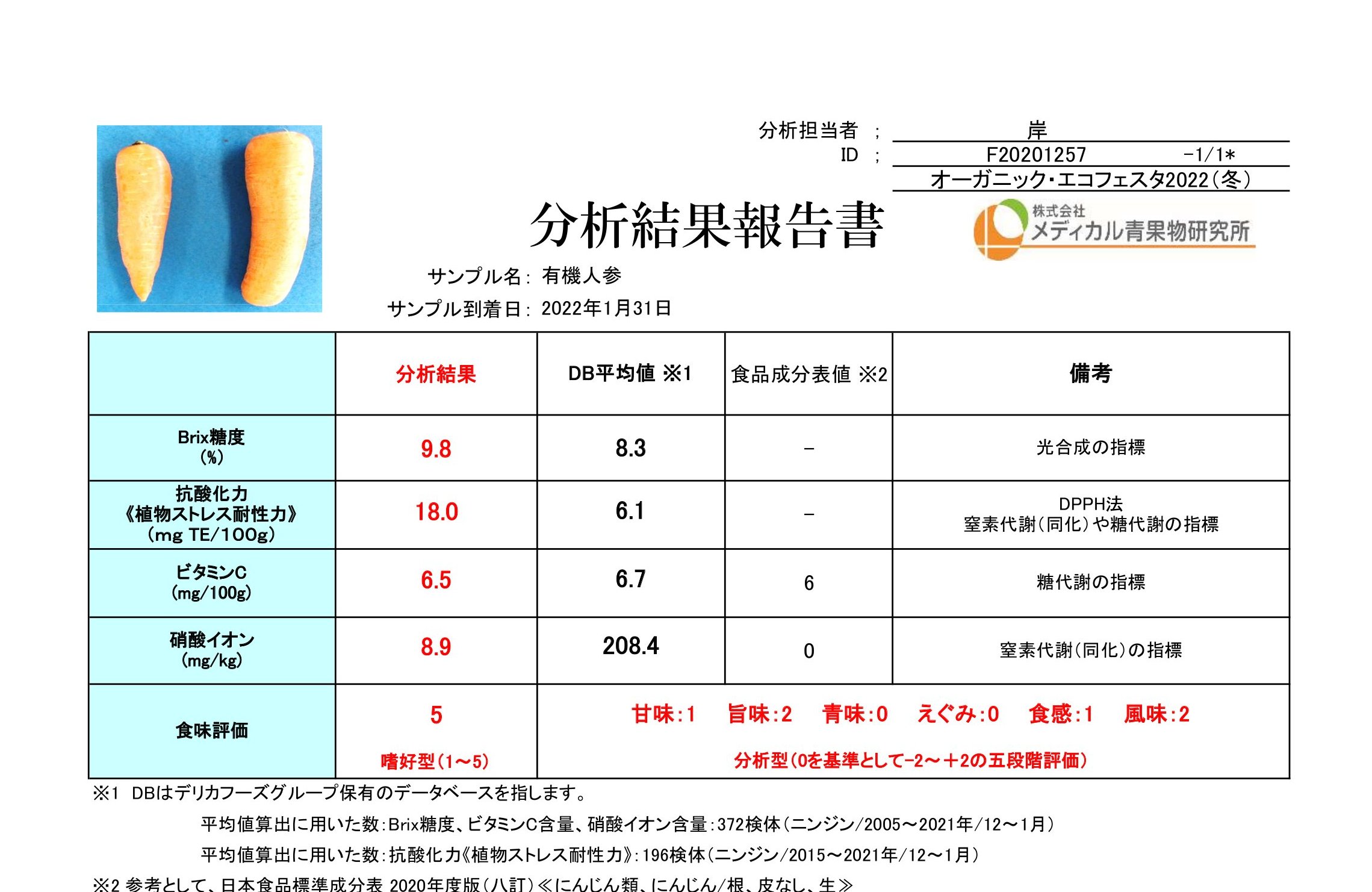 全国の有機にんじんの大会で有機の特色である大地の自然の栄養を示す数値が全国上位5番目であり、